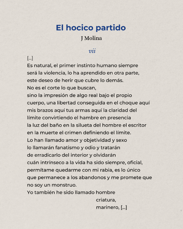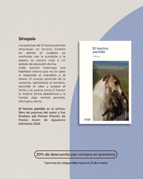 Los poemas de El hocico partido atraviesan un terreno incierto en donde el cuidado se confunde con la sumisión y la espera se parece más a un estado de devoción divina. En cada canto de esta épica a la mansedumbre, se interroga esa fidelidad íntima que no se sabe si responde al mandato o al deseo. El cuerpo aprende de la carencia, administra el hambre, esconde el rabo y acepta el límite y la caricia como si fueran lo mismo. Entre obediencia y la herida, algo animal persiste, dócil pero alerta.