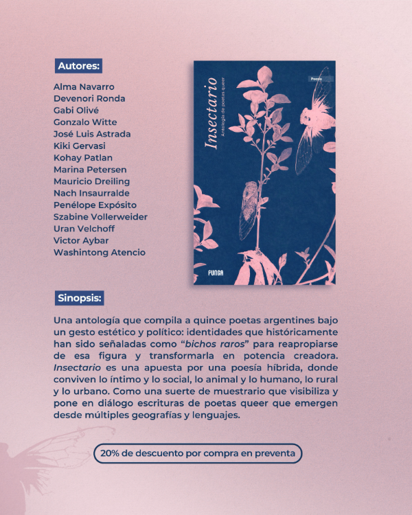Una antología que compila a quince poetas argentines bajo un gesto estético y político: identidades que históricamente han sido señaladas como “bichos raros” para reapropiarse de esa figura y transformarla en potencia creadora. Insectario es una apuesta por una poesía híbrida, donde conviven lo íntimo y lo social, lo animal y lo humano, lo rural y lo urbano. Como una suerte de muestrario que visibiliza y pone en diálogo escrituras de poetas queer que emergen desde múltiples geografías y lenguajes.
