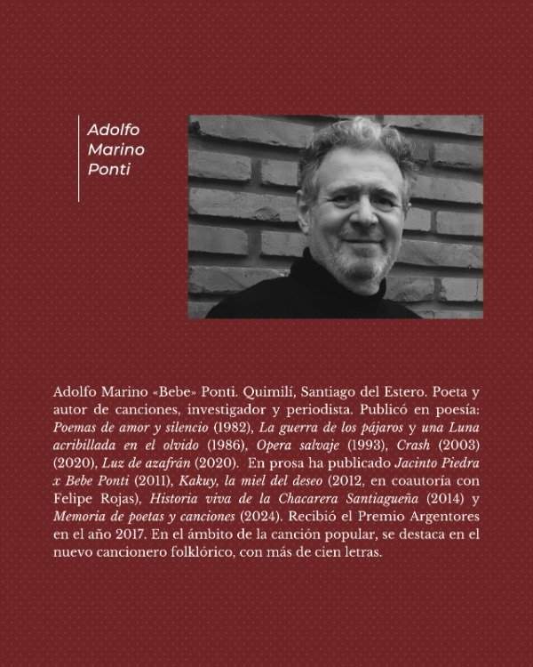 Adolfo Marino Ponti (Quimilí, Santiago del Estero) Poeta y autor de canciones, investigador y periodista. Publicó en poesía: Poemas de amor y silencio (1982), La guerra de los pájaros y una Luna acribillada en el olvido (1986), Ópera salvaje (1993), Crash (2003), Luz de azafrán (2020). En prosa: Jacinto Piedra (2011), Kakuy, la miel del deseo (en coautoría con Felipe Rojas, 2012), Historia viva de la Chacarera Santiagueña (2014) y Memoria de poetas y canciones (2024). En 2017, recibió el Premio Argentores.